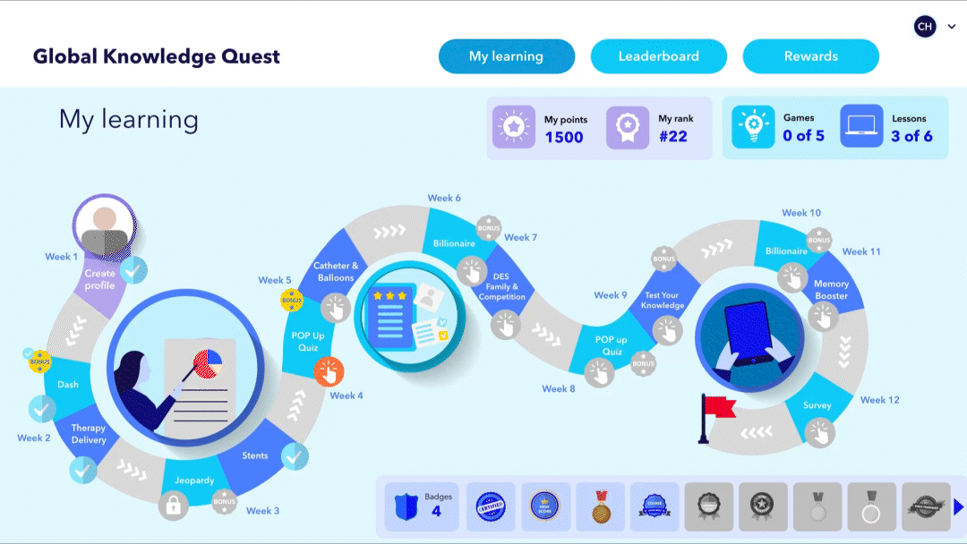The Medtronic CRDN team briefed us to create an app to increase engagement for both new and existing reps with the extensive amount of training content. They hoped to increase retention and behavior modification from the training by increasing utilization of their offerings via gamification.