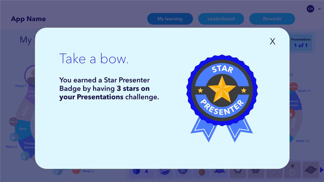 Add fun elements to increase visual interest by having animated badges show up in pop-ups every time you log in. Confetti backgrounds, fun illustrations, and game board style interface.